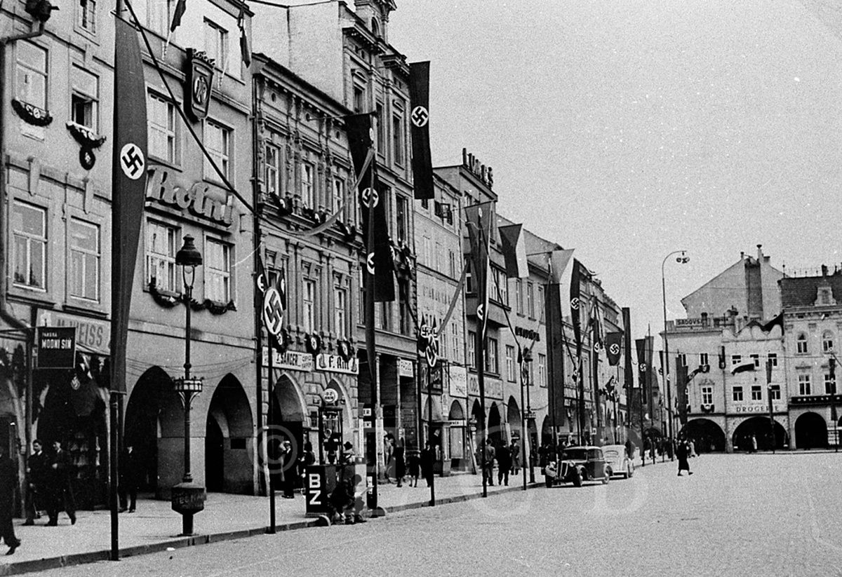 Benzinová pumpa na Adolf Hitler Platz (náměstí Přemysla Otakara II.).