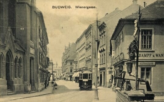 Vídeňská třída asi nikomu nic neřekne, takže ulice Karla IV. Pohled směrem k náměstí. Vlevo je vidět kousek kostela sv. rodiny. Pohlednice z roku 1910.