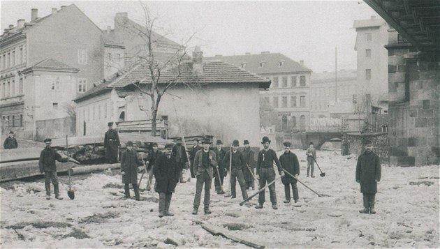 Odklízení nahromaděného ledu z Botiče v roce 1893, foceno z pod železničního mostu.