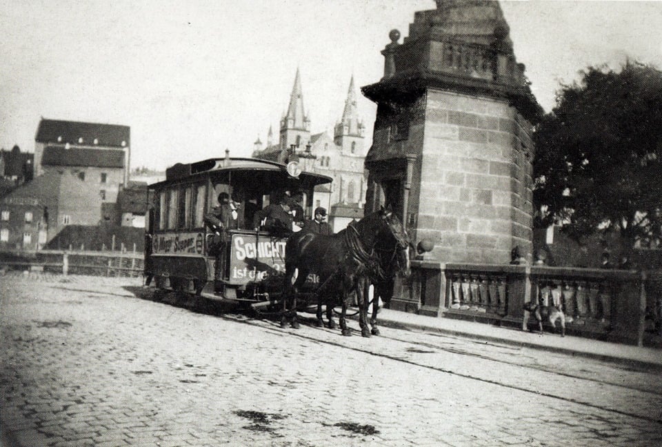 V létě 1897 vyfotografoval koňku na Palackého mostě neznámý fotoamatér.