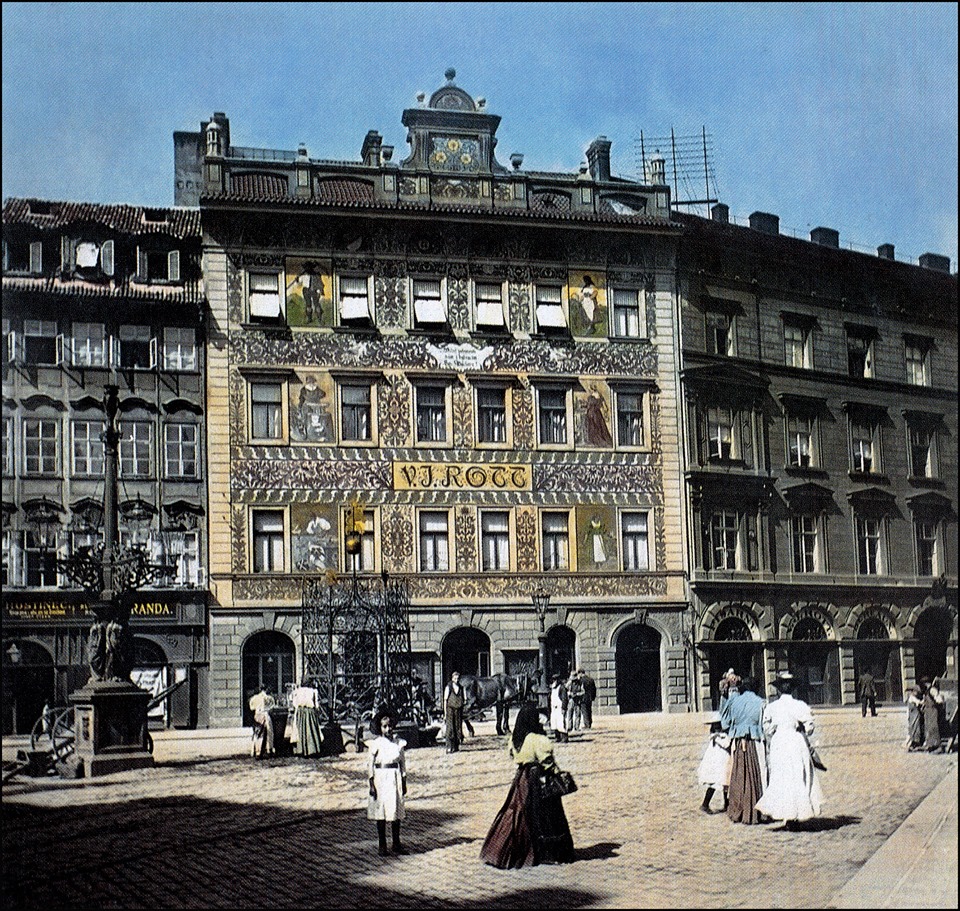 Železářství Rott na kolorovaném diapozitivu Františka Krátkého kolem roku 1897