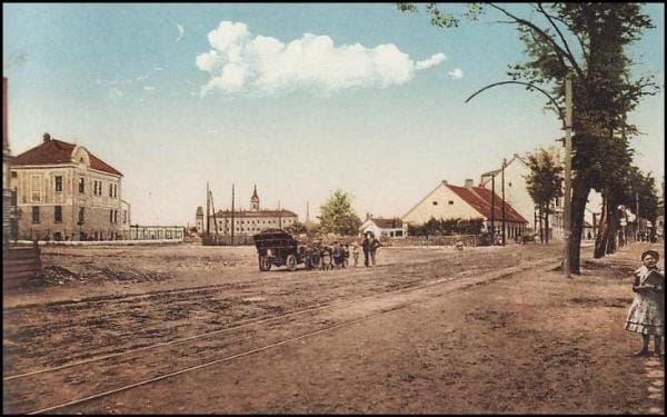 Pohled z dnešní Lidické ulice směrem ke kasárnám ještě bez kostela sv. Jana Nepomuckého. Rok 1910.