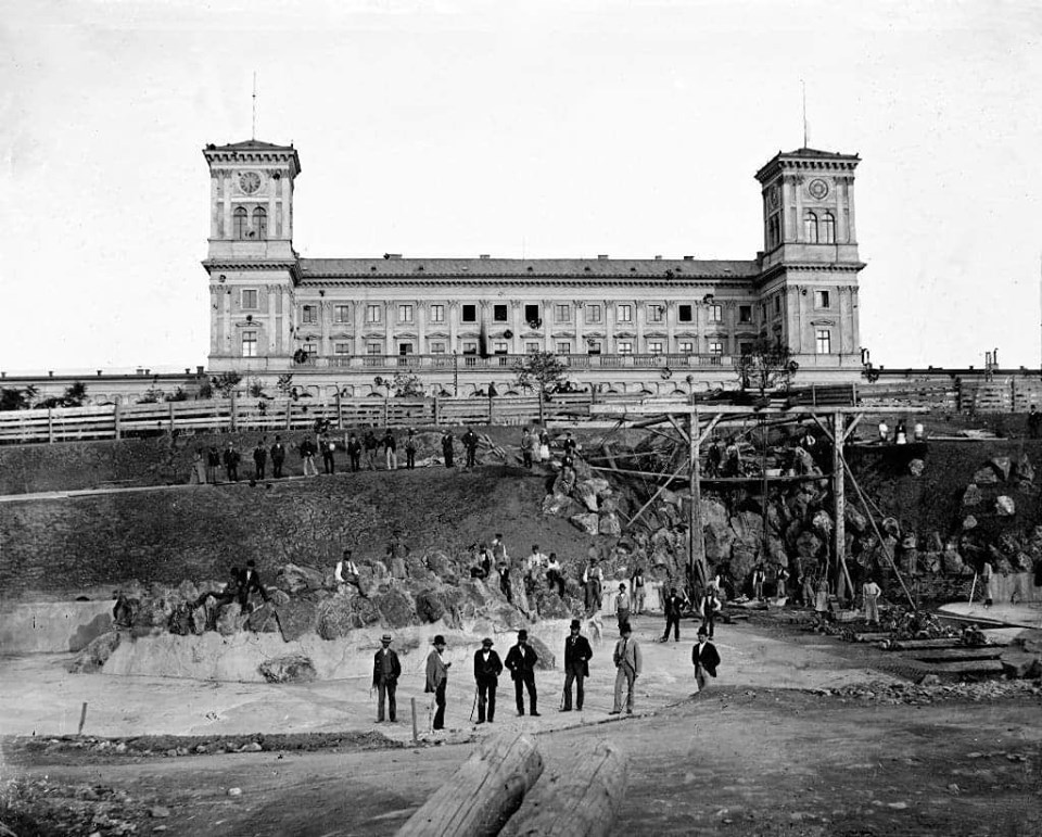 Budování parku před nádražím císaře Františka Josefa, kolem 1878.