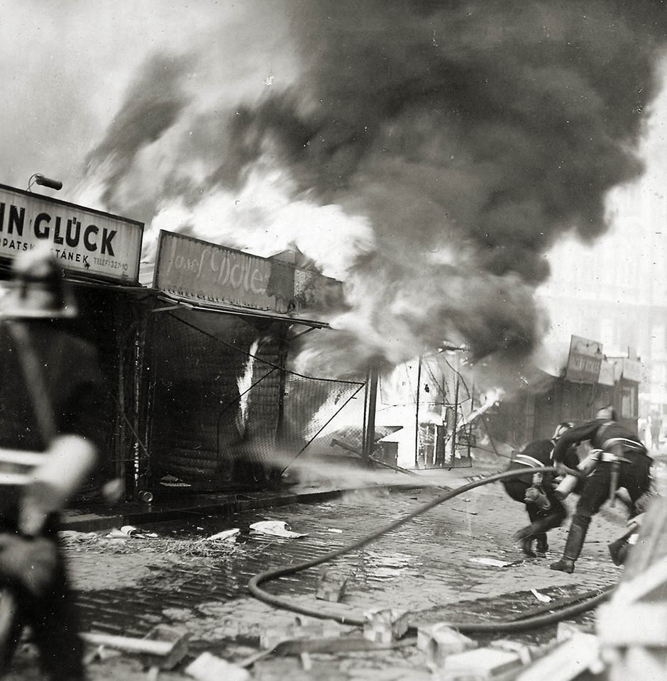 Požár trhoveckého stánku na Senovážném náměstí (dříve Havlíčkově) ve třicátých letech