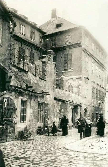 z Červené ulice (dnes parčík) u Staronové synagogy, domy byly zbořeny mezi lety 1903-1905.