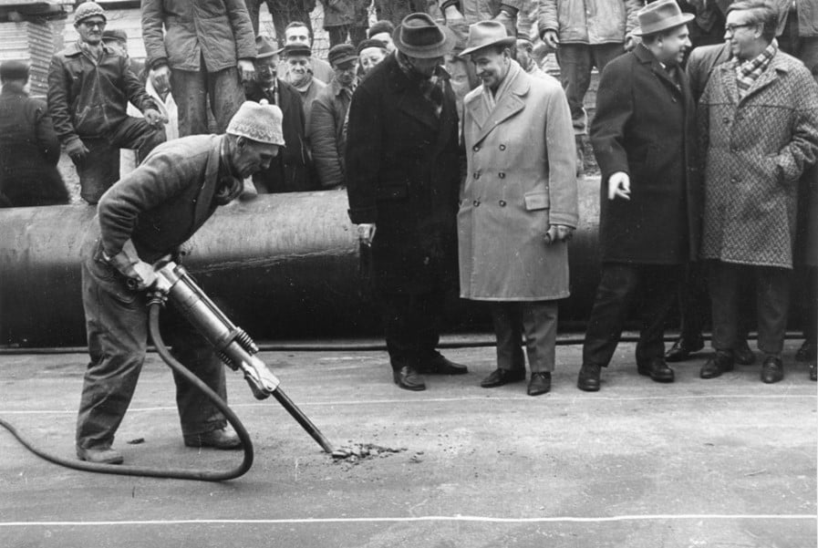 Stavba metra byla zahájena 6.1.1966 dělníkem Josefem Bartošem s údajně pozlacenou sbíječkou