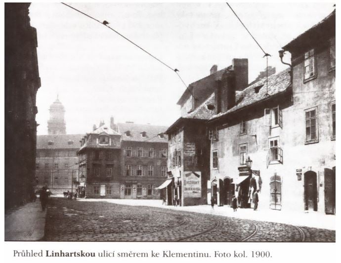 Průhled Linhartskou ke Klementinu kolem r. 1900