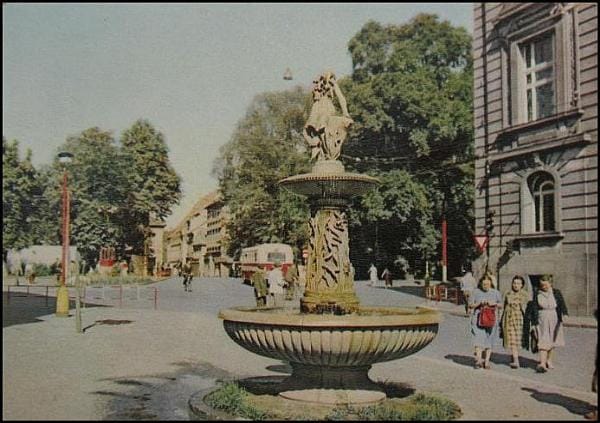 Kašna na Malinovského třídě (dnes Lannova) Pohled směrem k náměstí. Rok 1961.
