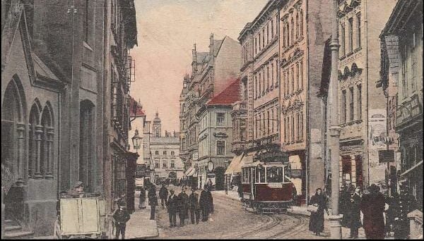 Kdysi Vídeňská třída dnes ulice Karla IV. V pozadí radnice a vpravo rohový dům palác Včela. Rok 1916.