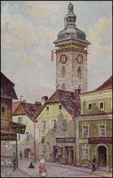 Pohled na Černou věž z Kněžské ulice, vlevo roh domu Špalíček. Rok 1916