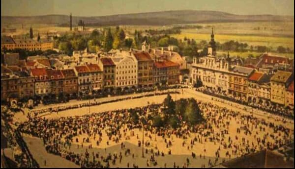 Pohled z Černé věže na náměstí v době trhů. Rok 1915.
