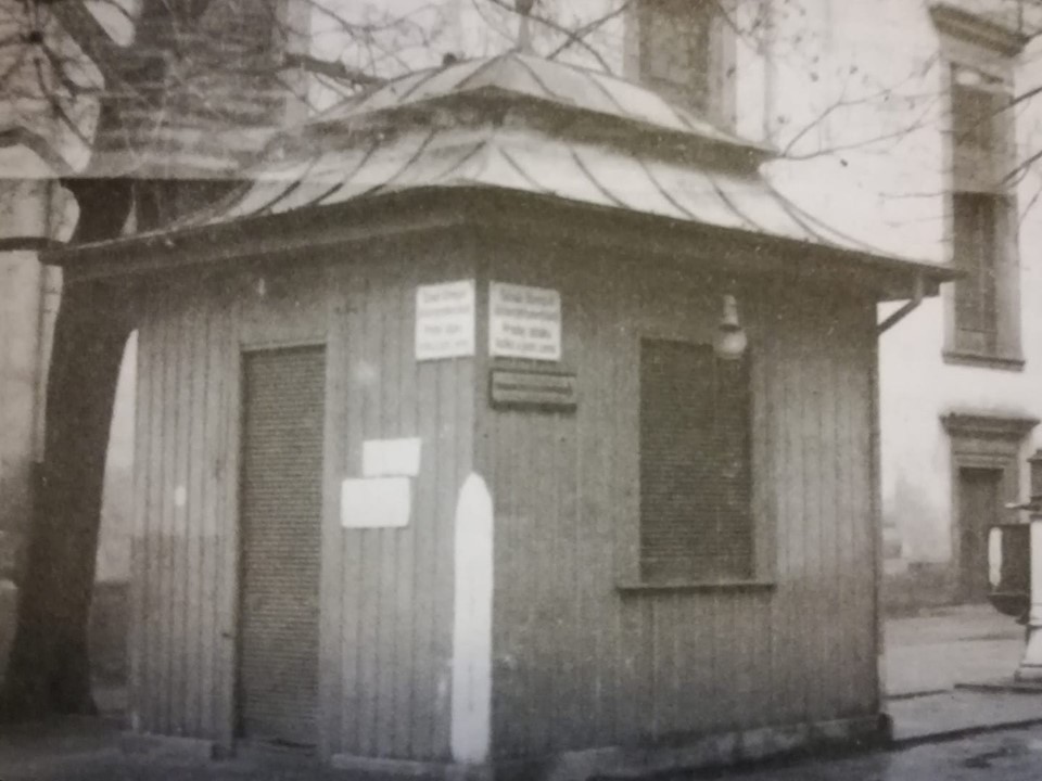 Trafika u jižní strany kostela sv. Mikuláše. Rok 1942.