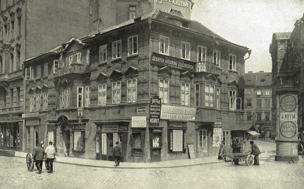 Dnes již zbořený Braunův dům na nároží Vodičkovy a Jungmannovy ulice v roce 1910