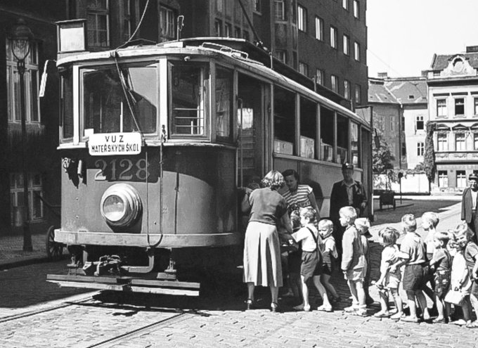 Pohled na vůz mateřských škol, který vozil po Praze děti na výlety v 50. a 60. letech minulého století
