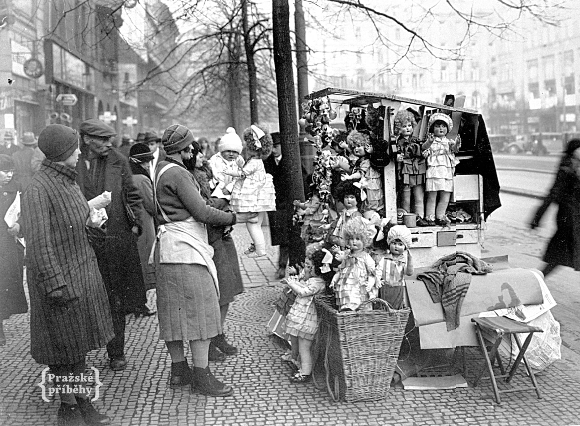 Předvánoční prodej panenek na Václavském náměstí v roce 1932