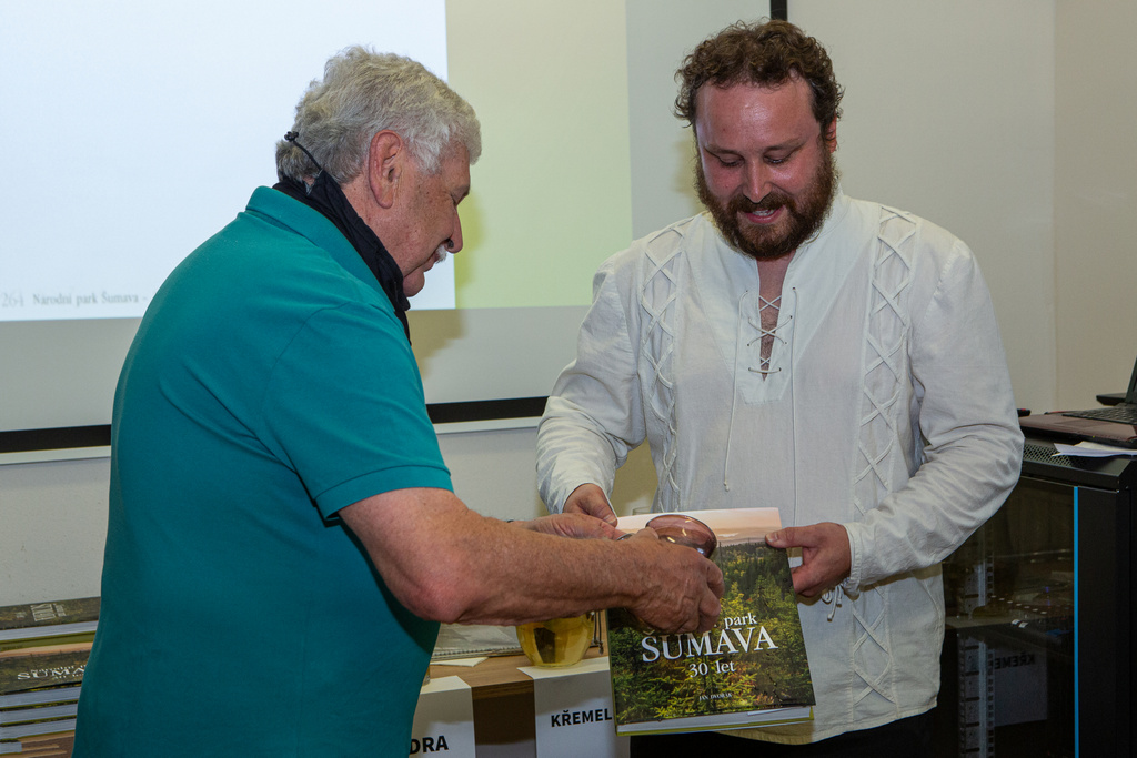 Senátor Václav Chaloupek křtí knihu Národní park Šumava - 30 let autora Jana Dvořáka. Foto Štěpán Rosenkranz