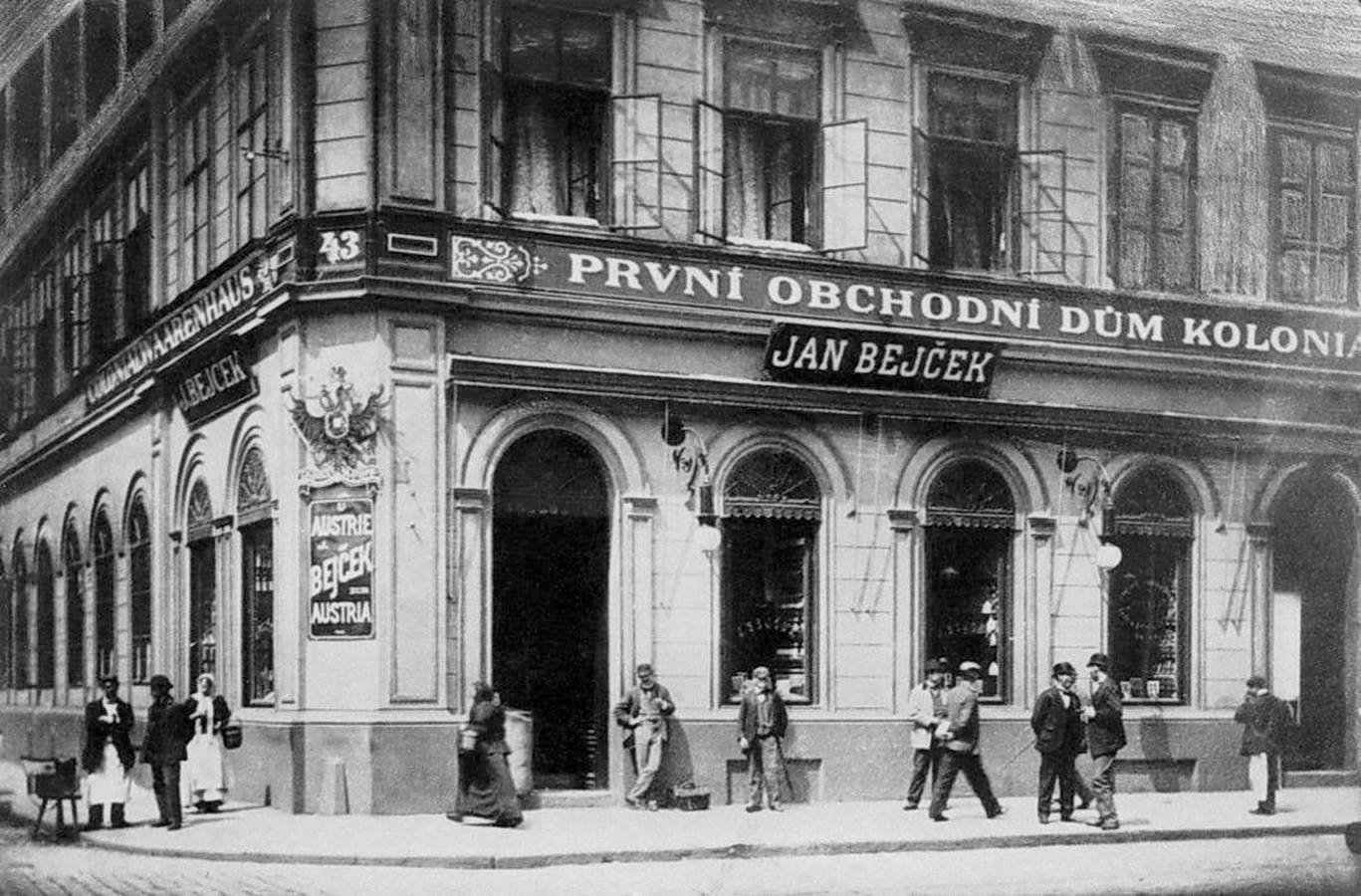 DomůFOTOGALERIE: Praha historickáSmíchov. První obchodní dům koloniálním zbožím Jana Bejčka v paláci Austria na rohu dnešní Štefánikovy a Kartouzské ulice