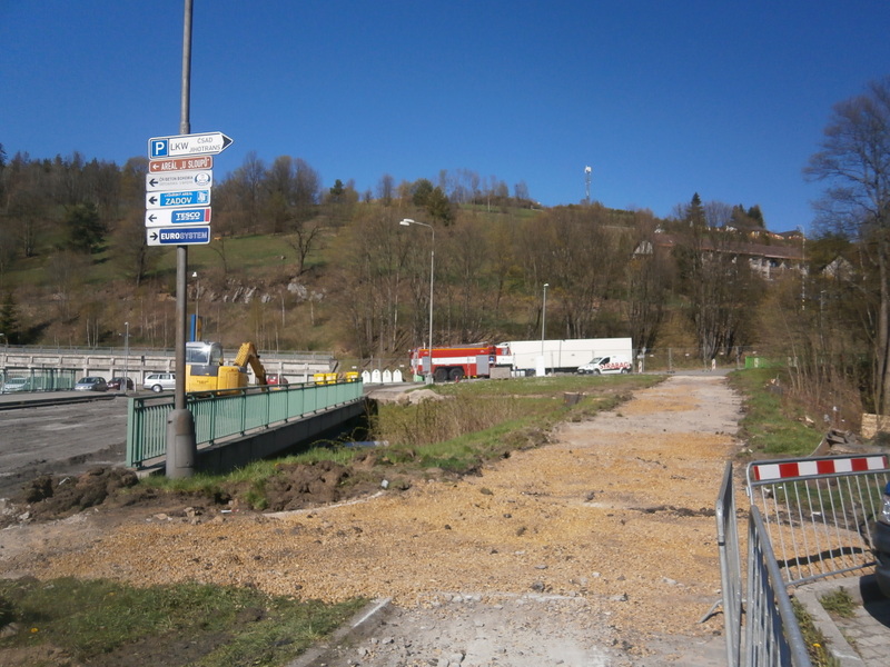 OKRUŽNÍ KŘIŽOVATKA: Stopka na mostě také pro chodce. Tápali, kudy to mají obejít. Značení trasy chybí