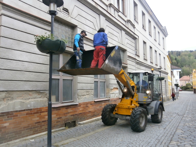 VŠÍMAVÝ OBJEKTIV: Pracovníci městských služeb rozvěšují ve starém městě nádoby s květinami
