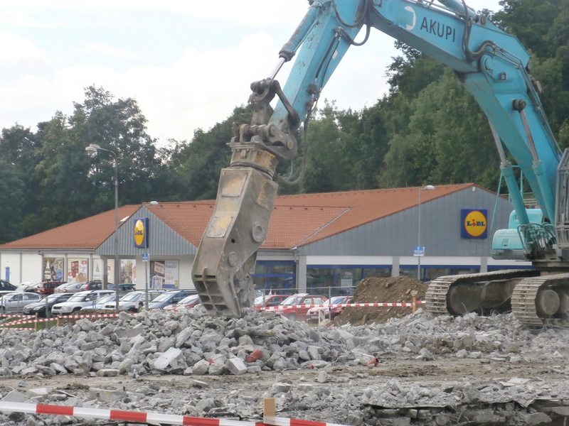 OBRAZEM: Šikovný stroj začal ukusovat z mostu přes Pravětínský potok. Postupně jej celý rozebere