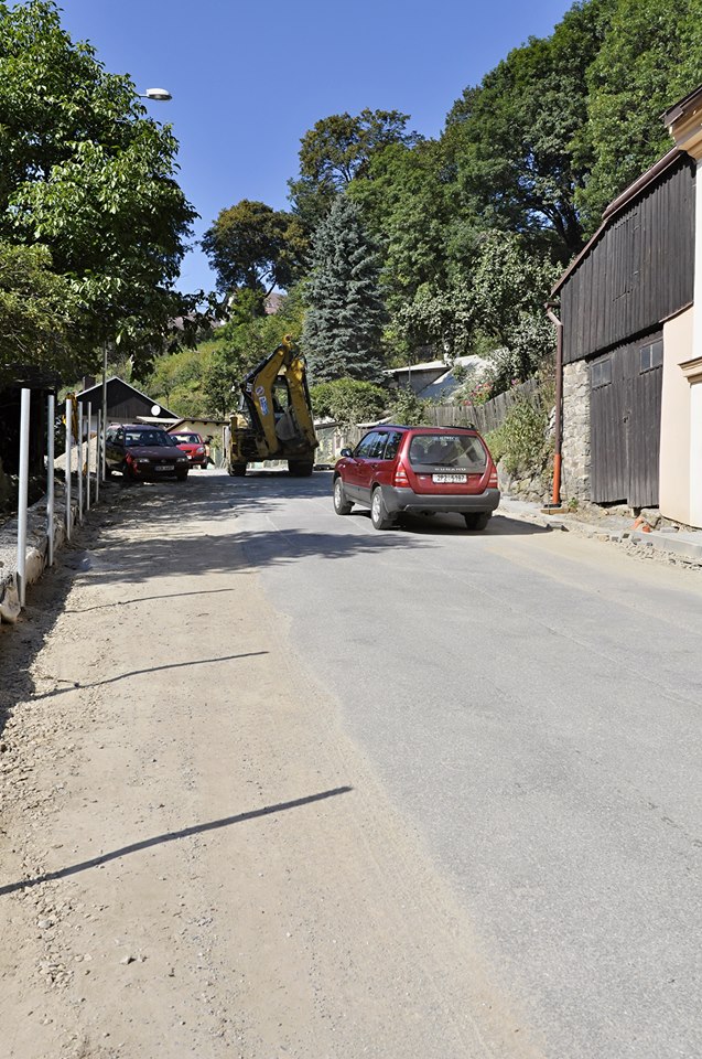 OBRAZEM: Stavba nového chodníku v Pivovarské ulici ve Vimperku. Dělníci začali pokládat zámkovou dlažbu