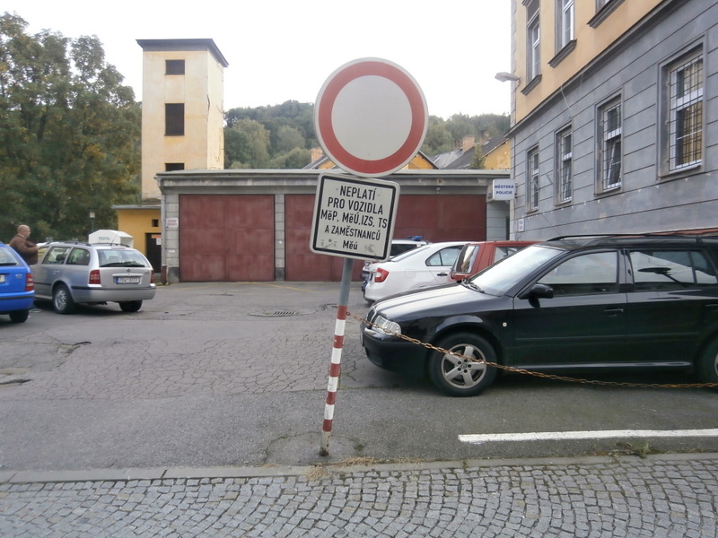 VŠÍMAVÝ OBJEKTIV: Vychýlená dopravní značka na parkovišti u městské policie. Kdo to způsobil?