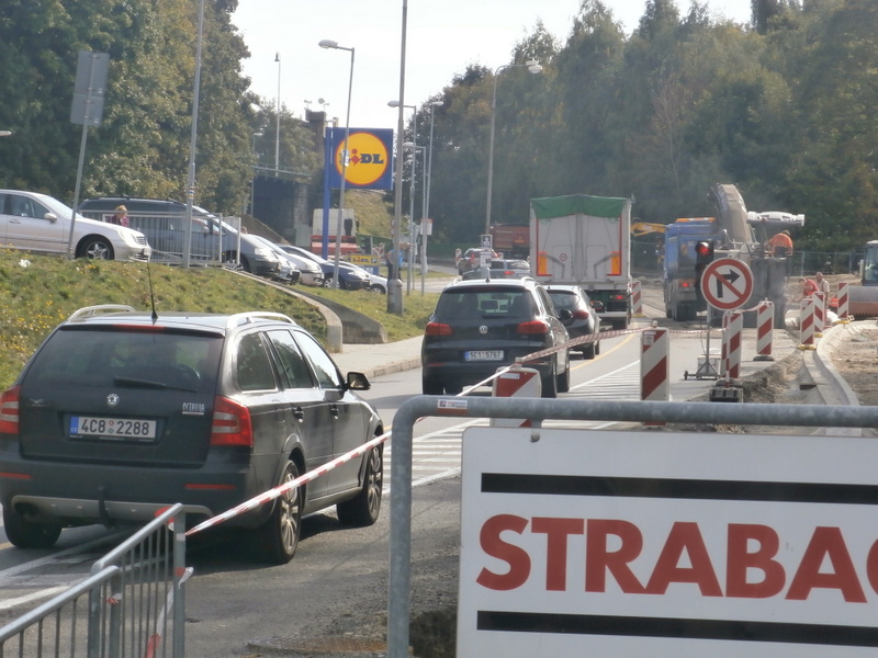 OKRUŽNÍ KŘIŽOVATKA: Doprava podél staveniště je řízena semafory. V sobotu frézovali povrch vozovky