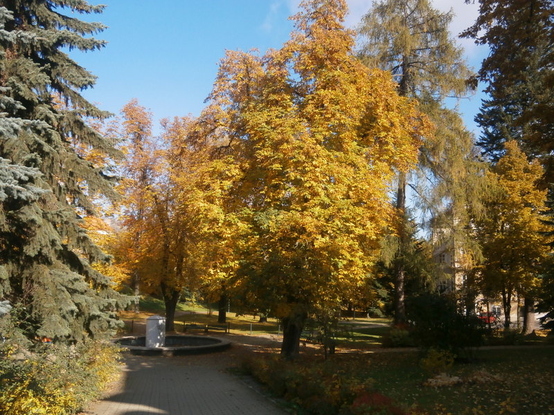 OBRAZEM: Podzim vybarvil stromy ve vimperském parku a sluneční paprsky tu přírodní krásu prosvítily