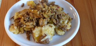 Zapečené brambory s mletým hovězím masem a kapustou. Je to moc velká bašta, stačí dobře ochutit. Prokládám brambory nakrájené na tenké plátky, maso a podušenou...