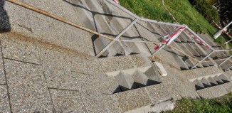 Vimperk, sídliště Míru, pátek 22. dubna. Na několika místech sídliště Míru lze vidět podobné obrázky. Radnice nechala opravit rozpadající se schody. Chválíme.
