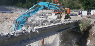 Už jen malá část mostu přes Pravětínský potok u autobusového nádraží ve Vimperku zbývá odstranit, aby v místě mohla pokračovat stavba okružní křižovatky. Finále...
