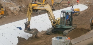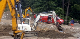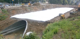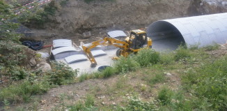 Vimperk, stavba okružní křižovatky u autobusového nádraží - zasypávání tubusu, kterým povede koryto Pravětínského potoka.
