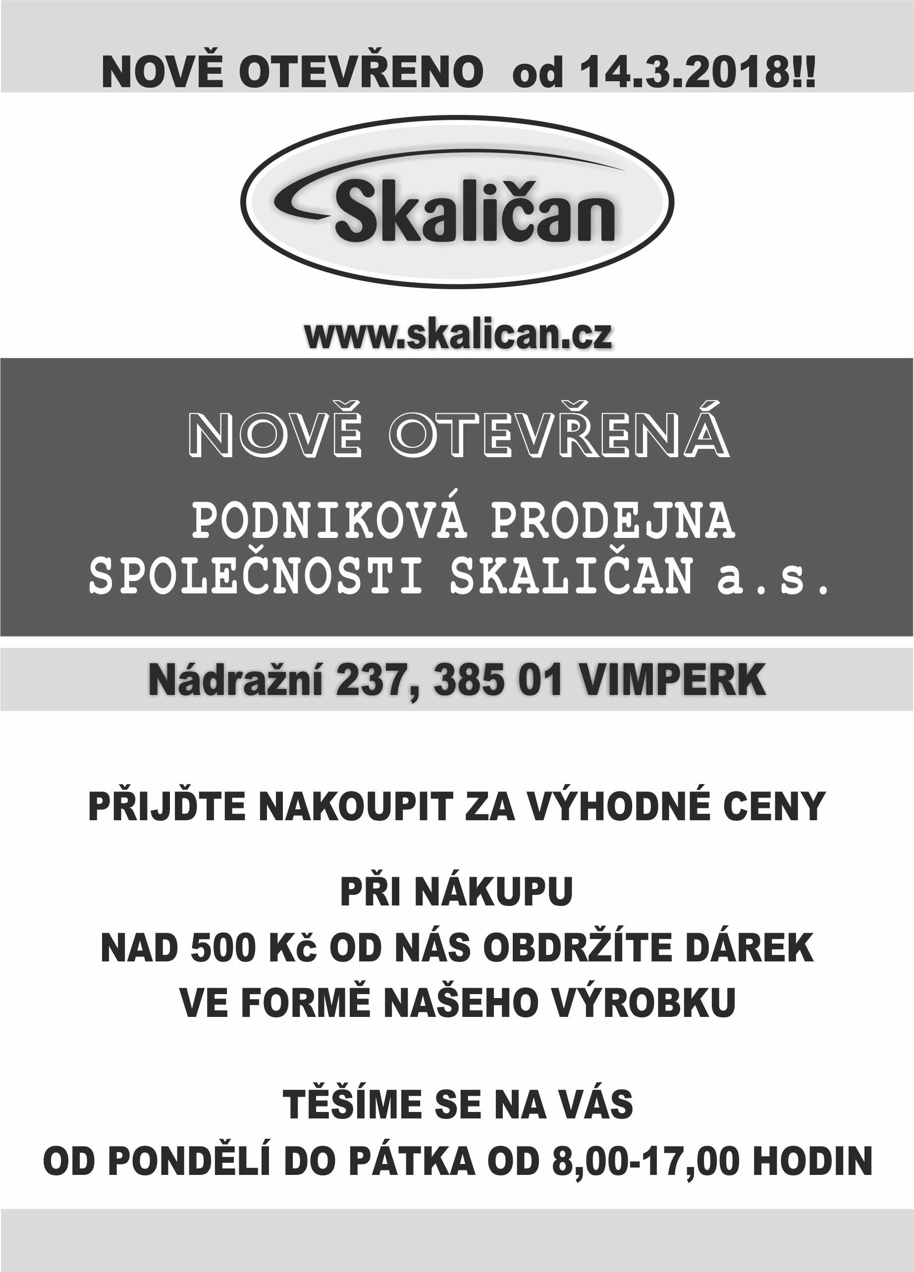 Úspěšná firma Skaličan z České Skalice otevřela v Nádražní ulici (naproti autobusovému nádraží) ve Vimperku svoji podnikovou prodejnu výsekového masa a uzenin z vlastní produkce. Přijďte si nakoupit kvalitní české potraviny za výhodné ceny. Z bohatého sortimentu si určitě vyberete.