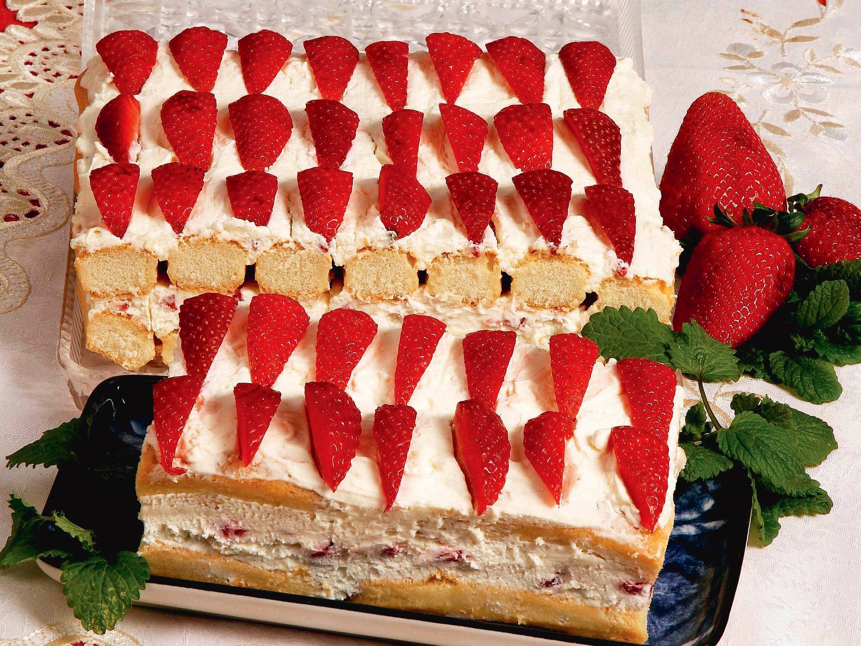 Piškoty zlehka namočíme do naředěné ovocné šťávy a rozložíme v jedné vrstvě na dno menší obdélníkové formy. Potřeme polovinou krému, poklademe kousky jahod a na ně rozložíme druhou vrstvu namočených piškotů. Piškoty potřeme zbylým krémem a povrch ozdobíme pokrájenými jahodami. Necháme vychladit.