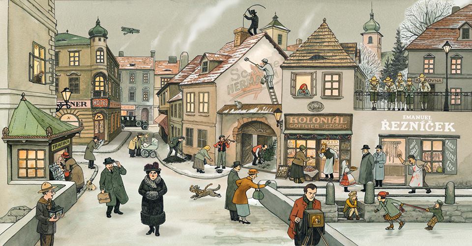 Letos je adventní kalendář Lucie Lomové připomínkou 100 let Československa a zachycuje vánoční atmosféru v ulicích právě před sto lety. Na interaktivním obrázku tak můžete potkat nejenom prvního československého prezidenta T. G. Masaryka, operní pěvkyni Emu Destinnovou, spisovatele Eduarda Štorcha (Lovci mamutů)… ale i zažít na vlastní kůži atmosféru první čtvrtiny 20. století, s prozářenými obchůdky, s dětmi hrajícími si v ulicích (nyní to působí jako téměř zázrak), s pouličním hráčem na housličky, s dobovým fotografem s obřím deskovým fotoaparátem, skautíky, s trafikou dýchající cizokrajnou exotikou, s uhlířem vysypajícím do sklepa putnu s uhlím, typickým kominíkem balancujícím po střechách, historickým automobilem v pozadí i s historickým aeroplánem – dvojplošníkem v povětří.