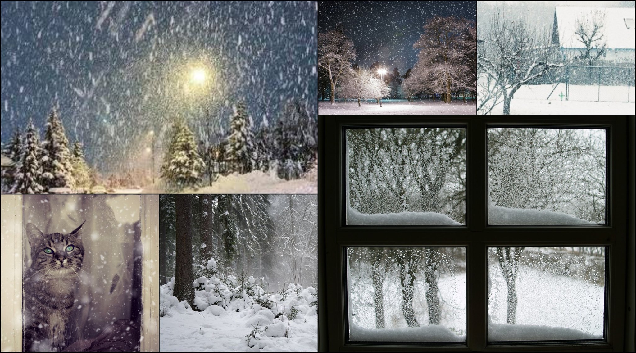 Za okny začal padat sníh… Vločky ozářené paprsky slunce se tiše snášejí k zemi…