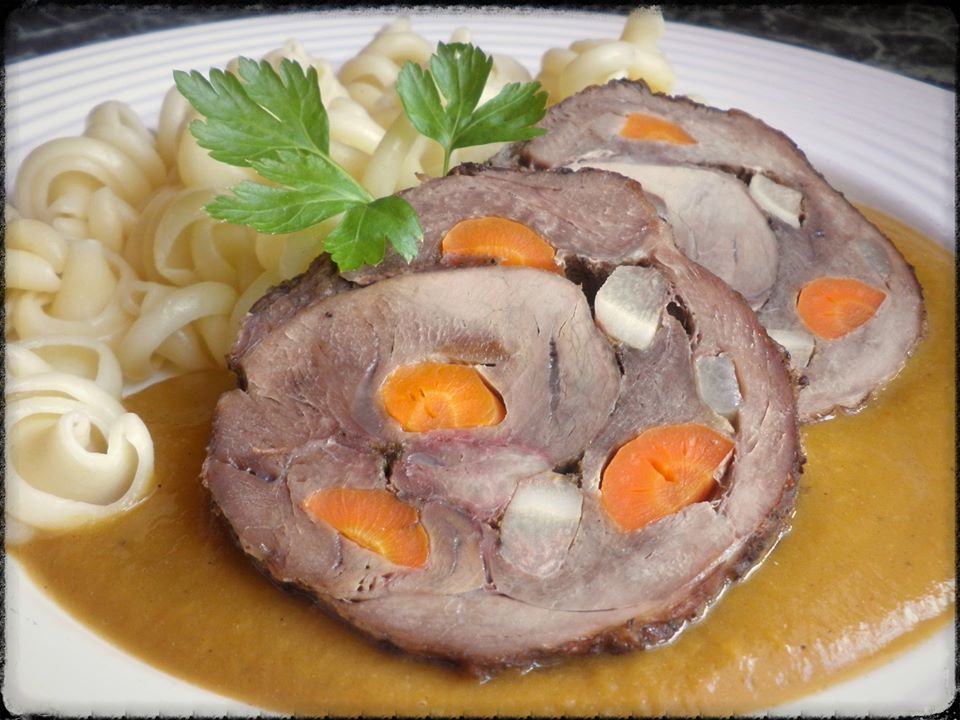 Maso zbavíme tuku a odblaníme, z obou stran osolíme a posypeme divokým kořením, prošpikujeme slaninou a hranolky mrkve a petržele, pevně srolujeme a převážeme provázkem.