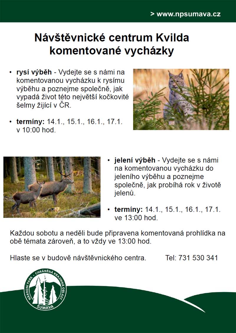 „Každý týden bude připraveno až osm komentovaných prohlídek jak k jelenům, tak rysům, z toho o víkendech jsou naplánovány dvě vycházky. Informace v průběhu komentovaných prohlídek zajistí jak personál návštěvnického centra, tak také kolegové z územních pracovišť, tedy lesnický personál, který dokonale zná nejen zvířata v návštěvnických centrech, ale dokáže z vlastních zkušeností sdělit zajímavosti ze života divoce žijících zvířat,“ informuje vedoucí Informačních středisek a Středisek environmentální výchovy Martina Kučerová.