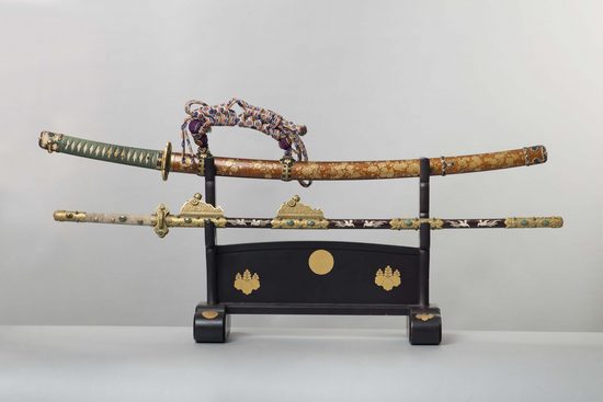- Na fotografii níže: meč našidži gošiči no kiri koširae tači z držby císařské rodiny, signováno Rai Kunitoši, čepel konec 13. století, příslušenství 19. století a dvorský ceremoniální meč kazaridači z přímé držby císařské rodiny, signováno Kimi banzai Tomonari, 2. polovina 19. století