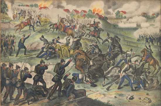 - Na obrazu níže: bitva u České Skalice 28. června 1866, dobový kolorovaný tisk