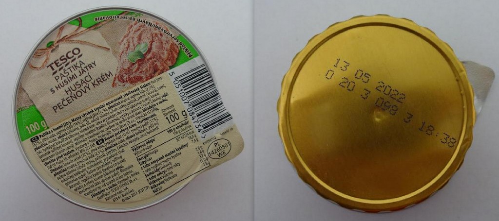 Státní zemědělská a potravinářská inspekce (SZPI) nařídila společnosti Tesco Stores ČR a.s., aby neprodleně stáhla ze svých poboček falšovanou potravinu Tesco Paštika s husími játry v balení 100 g, s označením data minimální trvanlivosti do 13. 5. 2022, vyrobeno v Polsku.