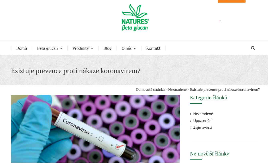 2. Reklama na doplňky stravy na stránce www.enatures.cz/existuje-prevence-proti-nakaze-koronavirem/, kontrolovaná osoba zde v rámci reklamy na doplněk stravy uváděla nepovolená léčebná tvrzení: „lék a vakcínu“, „koronavirus“, „koronavirem“, „onemocněním“, „viru“, „kašlání“, „kýchání“, „nákazy koronavirem“, „prevence“, „viry a bakteriálními útoky“, „onemocněním“, „akutním respiračním infekcím a chřipce“ a „proti virům, parazitům, plísním nebo bakteriím“. Provozovatelem je dle informace na webových stránkách společnost NATURES s.r.o., Trnava, Slovensko. SZPI informaci vložila do evropského systému pro komunikaci mezi evropskými dozorovými organizacemi – AACS – se žádostí o uložení opatření ze strany slovenského kontrolního orgánu.