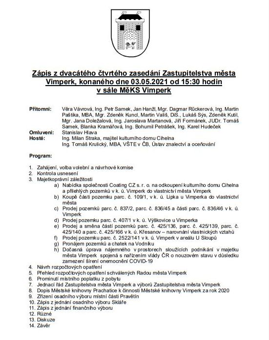 DOKUMENT: Zápis z 24. zasedání Zastupitelstva města Vimperk, konaného 3. května 2021