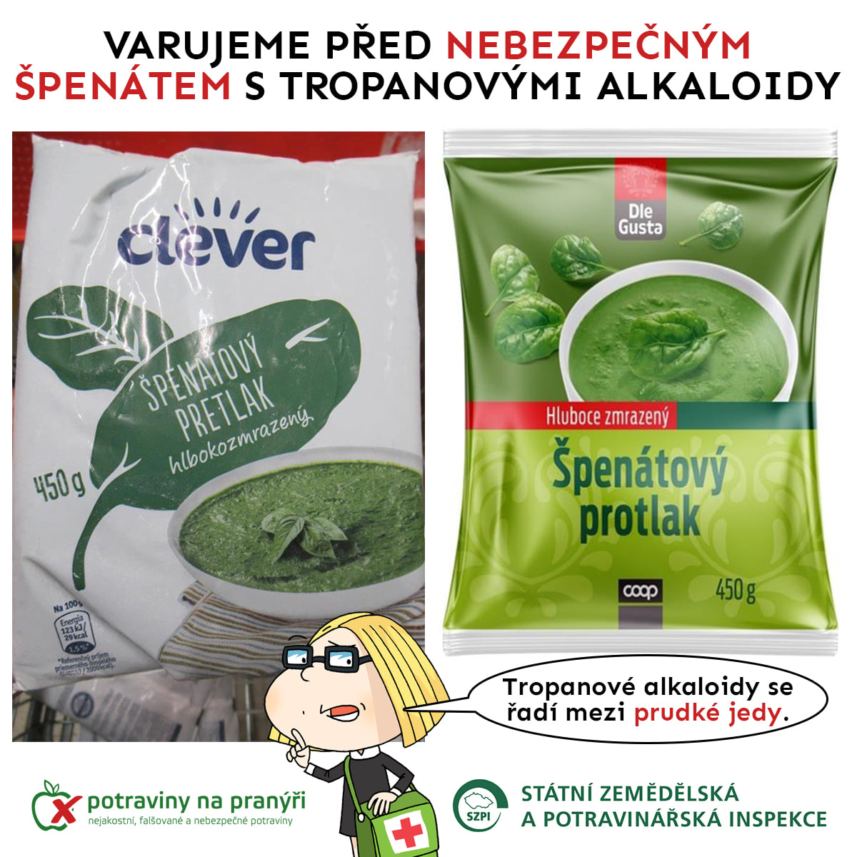 Státní zemědělská a potravinářská inspekce (SZPI) varuje spotřebitele před nebezpečnou potravinou v tržní síti: Hluboce zmrazený špenátový protlak 450 g, výrobce: EQUUS a.s., závod Vinica, Cesta slobody 771, 991 28 Vinica, vyrobeno pro: EQUUS a.s., Hviezdna 38, 821 06 Bratislava, Slovensko.
