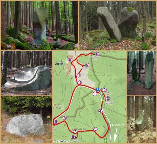 Blíže k obci Zuklín pak narazíte na Sluneční kámen, údajně dříve sloužící k léčbě ženských nemocí, a téměř 3 metry vysoký kámen Mudrc. Jméno si vysloužil díky své rozšířené horní části připomínající jakousi moudrou hlavu. Působení menhirů si zde může každý vyzkoušet na vlastní kůži. Již při vstupu do lesa, v němž je