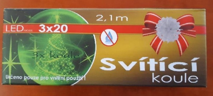 Česká obchodní inspekce zjistila v ČR nabídku a prodej nebezpečného výrobku – světelného řetězu LED DIODS 3×20 Svítící koule s nevyměnitelnými světelnými zdroji. Produkt je opatřený elektronickou jednotkou pro tvorbu světelných efektů a vysouvací dvojpólovou vidlicí. Na výrobku uvedeno: CE, stručné bezpečnostní informace v českém jazyce (také v jazyce SK a PL) kde bylo uvedeno mj. „Světelné zdroje (žárovky jsou nevyměnitelné“, 230V/50Hz, zn. pro střídavý proud. Na vidlici uvedeno: CE, 2,5A, 250V a zn. pro střídavý proud. Na elektronické jednotce uvedeno: LED, 12V-250V 50Hz. Na obalu uvedeno: LED DIODS 3×20 Svítící koule, 3x koule, 2,1m určeno pouze pro vnitřní použití, stručný návod k použití výrobku a bezpečnostní instrukce v českém jazyce, kde bylo uvedeno mj. „Světelné zdroje (žárovky) jsou nevyměnitelné“, 3x koule, 230V, napájecí zdroj 230V/50Hz, jmen. Hodnoty svítidla 12V, třída ochrany svítidla II/Ip20, CE, zn. pro spotřebič třídy ochrany II, ITEM No: 4241212, EAN 8713142412120 a distribuce: Comfort life s.r.o., Kubánské nám. 1391/11, Praha 10, Czech Republic.
