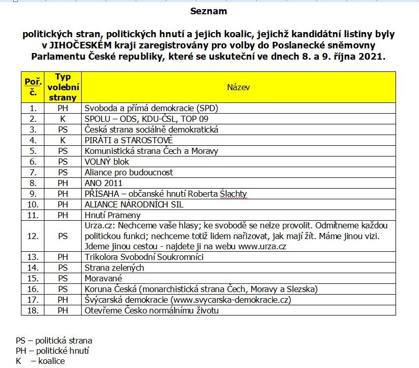 VOLBY 2021: Zaregistrované strany v Jihočeském kraji