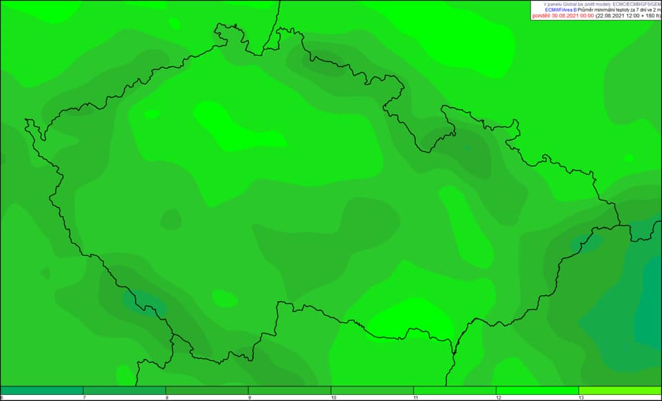 Průměr minimálních a maximálních teplot v právě započatém týdnu ukazují připojené mapy. Graf ukazuje průměrnou denní teplotu od začátku srpna včetně předpovědi do konce měsíce a odchylky od normálu. Průměrná teplota celého měsíce by měla skončit na hodnotě 16,3 °C, což je 1,2 °C pod normálem.
