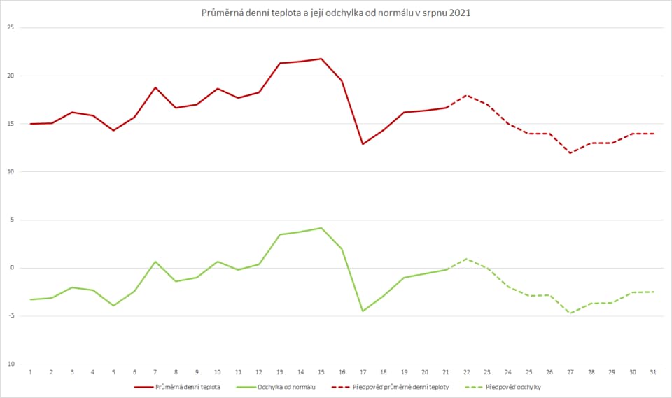 Chladnější než obvykle bude i srpen 2021 jako celek. Pouze 7 dnů v měsíci mělo kladnou odchylku od normálu. Mezi nimi byl i včerejšek, neděle 22. srpna, jehož odchylka od normálu se bude pohybovat pravděpodobně kolem +0,9 °C, avšak pouze na Moravě a ve Slezsku se včera maxima pohybovala kolem letních 25 °C.