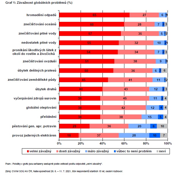 Za nejzávažnější globální problémy považují občané České republiky hromadění odpadů, znečišťování pitné vody, ovzduší a oceánů a pronikání škodlivých látek z okolí do rostlin a živočichů.